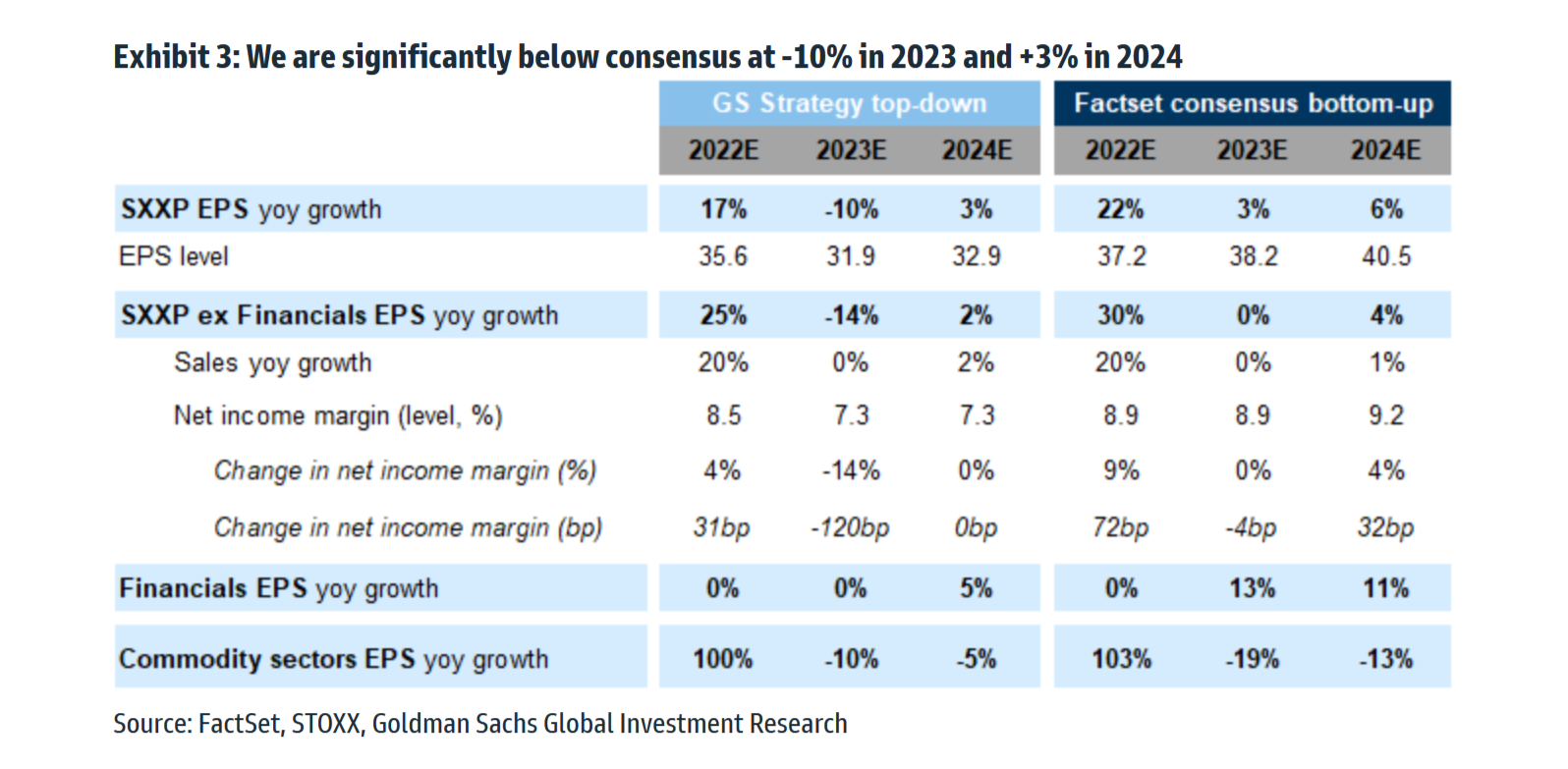 Υπό αυτό το πρίσμα, η ομάδα στρατηγικής της G.S μειώνει τις τιμές στόχους του Stoxx 600 στις 360, τις 380 και τις 410 μονάδες για ορίζοντα τριών, έξι και δώδεκα μηνών, που σηματοδοτούν μια πτώση της τάξεως του 8% σε διάστημα τριών μηνών (έως το τέλος του έτους) και μια απόδοση +5% σε διάστημα δώδεκα μηνών (+9% συμπεριλαμβανομένων των μερισμάτων). Ο στόχος που θέτουν οι αναλυτές σε ορίζοντα δώδεκα μηνών θα επαναφέρει ουσιαστικά τον δείκτη στα επίπεδα που βρέθηκε στα τέλη Αυγούστου. Παράλληλα, προχωρούν σε μείωση των τιμών στόχων και για τον FTSE 100 στις 6.600, στις 6.800 και στις 7.500 μονάδες (από 8.000). Η Bell τονίζει ως προς το σκέλος των EPS πως θα υπάρξουν περαιτέρω υποβαθμίσεις. Μέχρι στιγμής, οι υποβαθμίσεις ήταν περιορισμένες και το consensus εξακολουθεί να αναμένει αύξηση 3% στα EPS το 2023. Η Goldman Sachs παραμένει σημαντικά χαμηλότερα από το consensus και πιο συγκεκριμένα στο -10% για το 2023 και στο +3% για το 2024, με την κύρια διαφορά να εντοπίζεται στα περιθώρια. Το consensus ενσωματώνει σχεδόν σταθερά περιθώρια κέρδους παρά το υψηλότερο ενεργειακό κόστος, το κόστος εισαγωγών, το κόστος εργασίας, τα επιτόκια και την επιβράδυνση της ανάπτυξης.