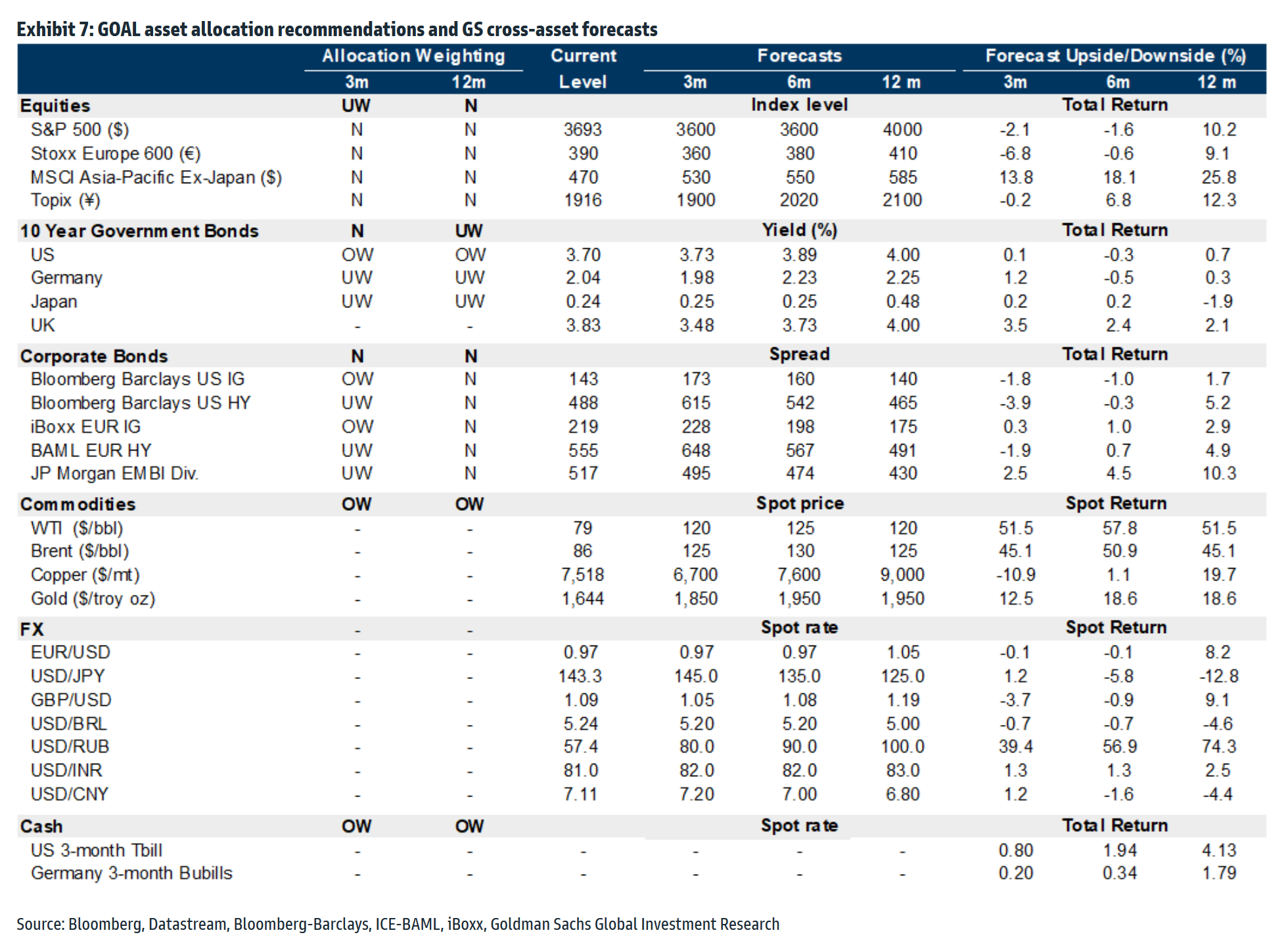 Από τη πλευρά του ο Christian Mueller-Glissmann, στρατηγικός αναλυτής της Goldman Sachs, συμπληρώνει πως η πίεση στις αποτιμήσεις και οι αρνητικές αναθεωρήσεις για την κερδοφορία των εταιρειών, οι οποίες είναι πιθανές στο τέλος του έτους, οδηγούν στην ευρύτερη υποβάθμιση των μετοχών στο portfolio, σε «underweight» σε ορίζοντα τριών μηνών. Αυτό είναι επίσης συνεπές με τα ευρήματα του αμερικανικού οίκου ότι οι μετοχές τείνουν να πλήττονται έντονα στην τελευταία φάση ενός κύκλου αύξησης των επιτοκίων, δηλαδή σε τρεις έως έξι μήνες πριν από την κορύφωση των αποδόσεων των διετών αμερικανικών ομολόγων, ενώ παραμένει «overweight» στα μετρητά σε ορίζοντα τριών και δώδεκα μηνών, και αναβαθμίζει σε «ουδέτερη» τη σύσταση για τα εταιρικά ομόλογα (σε διάστημα τριών μηνών) με έμφαση στους δείκτες αναφοράς εταιρικών ομολόγων επενδυτικής βαθμίδας, καθώς δείχνουν ελκυστικοί τόσο σε απόλυτες τιμές όσο και σε σύγριση με τις μετοχές.