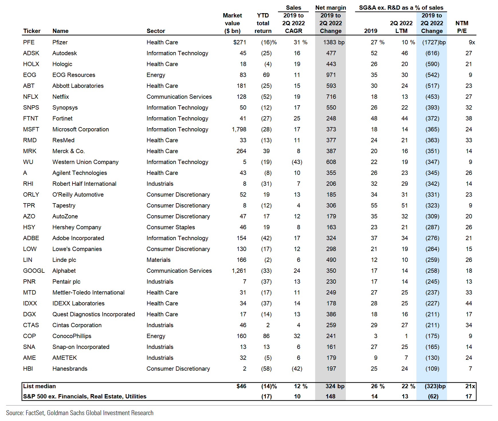 - Κατέχετε μετοχές εταιρειών με ανθεκτικά περιθώρια: Ο αμερικανικός οίκος προβάλει εταιρείες που έχουν αυξήσει τα περιθώρια κέρδους τους από τις αρχές του έτους, αναμένεται να τα αυξήσουν και το 2023 επιτυγχάνοντας μια αύξηση από το 2019 έως το 2022 περίπου ευθυγραμμισμένη με ή ελαφρώς χαμηλότερα από την τάση των προηγούμενων πέντε ετών.