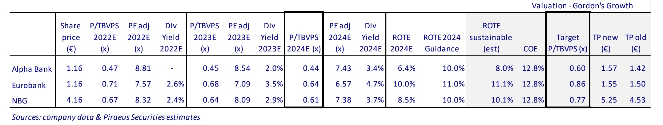 Ως προς τους τραπεζικούς τίτλους των τριών εκ των τεσσάρων συστημικών (δεν αξιολογεί την Τράπεζα Πειραιώς), η Piraeus Securities χρησιμοποιεί δείκτη αποδοτικότητας ενσώματων ιδίων κεφαλαίων ROTE στο 8% για την Alpha Bank, στο 10% για την Εθνική Τράπεζα και στο 11% για τη Eurobank, με ένα κόστος κεφαλαίου (CοE) στο 12,8% ώστε να φτάσει σε δείκτες P/TBVPS στο 0,6x για την Alpha Bank, στο 0,8x για την Εθνική Τράπεζα και στο 0,9x για τη Eurobank.