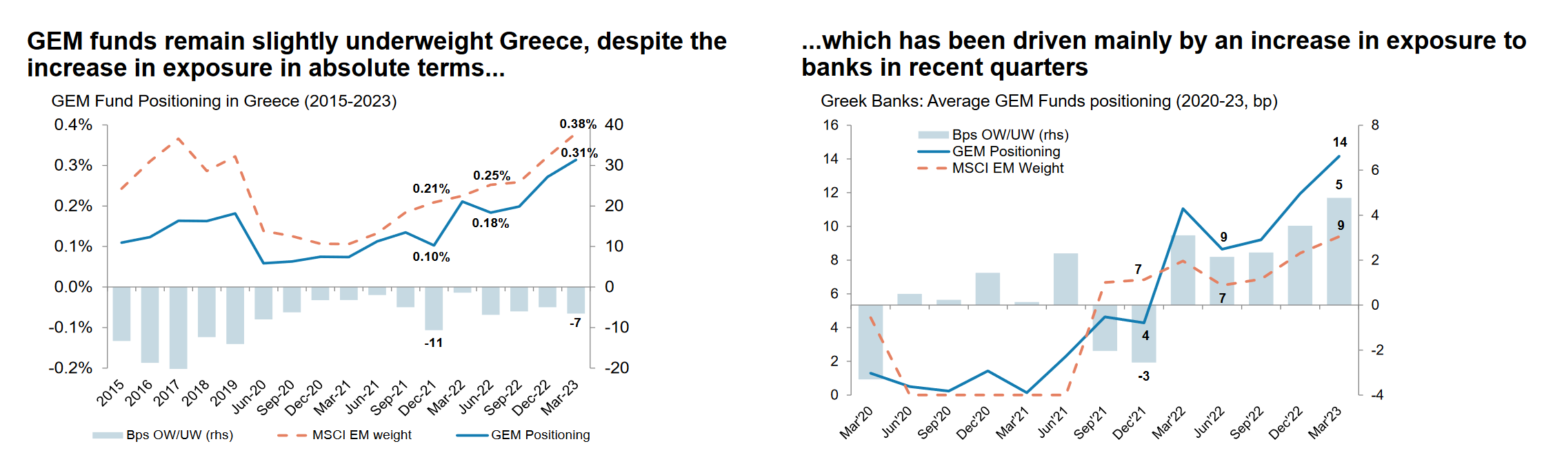 Επιπλέον, οι ελληνικές μετοχές έχουν καταγράψει ιδιαίτερα ισχυρές επιδόσεις σε ετήσια βάση και τα τεχνικά σημεία δείχνουν ότι βρίσκονται πλέον σε «υπεραγορασμένα» επίπεδα, αν και λιγότερο από ότι ήταν πριν τρεις μήνες. Οι διαχειριστές κεφαλαίων για τις αναδυόμενες αγορές (Global Emerging Markets Funds - GEM Funds) παραμένουν με μια ελαφρώς «underweight» θέση για την Ελλάδα, παρά την αύξηση της έκθεσής τους σε απόλυτες τιμές, η οποία οφείλεται κυρίως σε μια αύξηση της έκθεσης προς τις τράπεζες τα τελευταία τρίμηνα. Η Morgan Stanley στέκεται και στο σκέλος της αδυναμίας των καταναλωτών σε ευρωπαϊκή αλλά και σε ευρύτερη βάση για το 2023, κάτι που εγκυμονεί κινδύνους για την τουριστική περίοδο του επόμενου έτους - (βασική πηγή εσόδων του προϋπολογισμού).