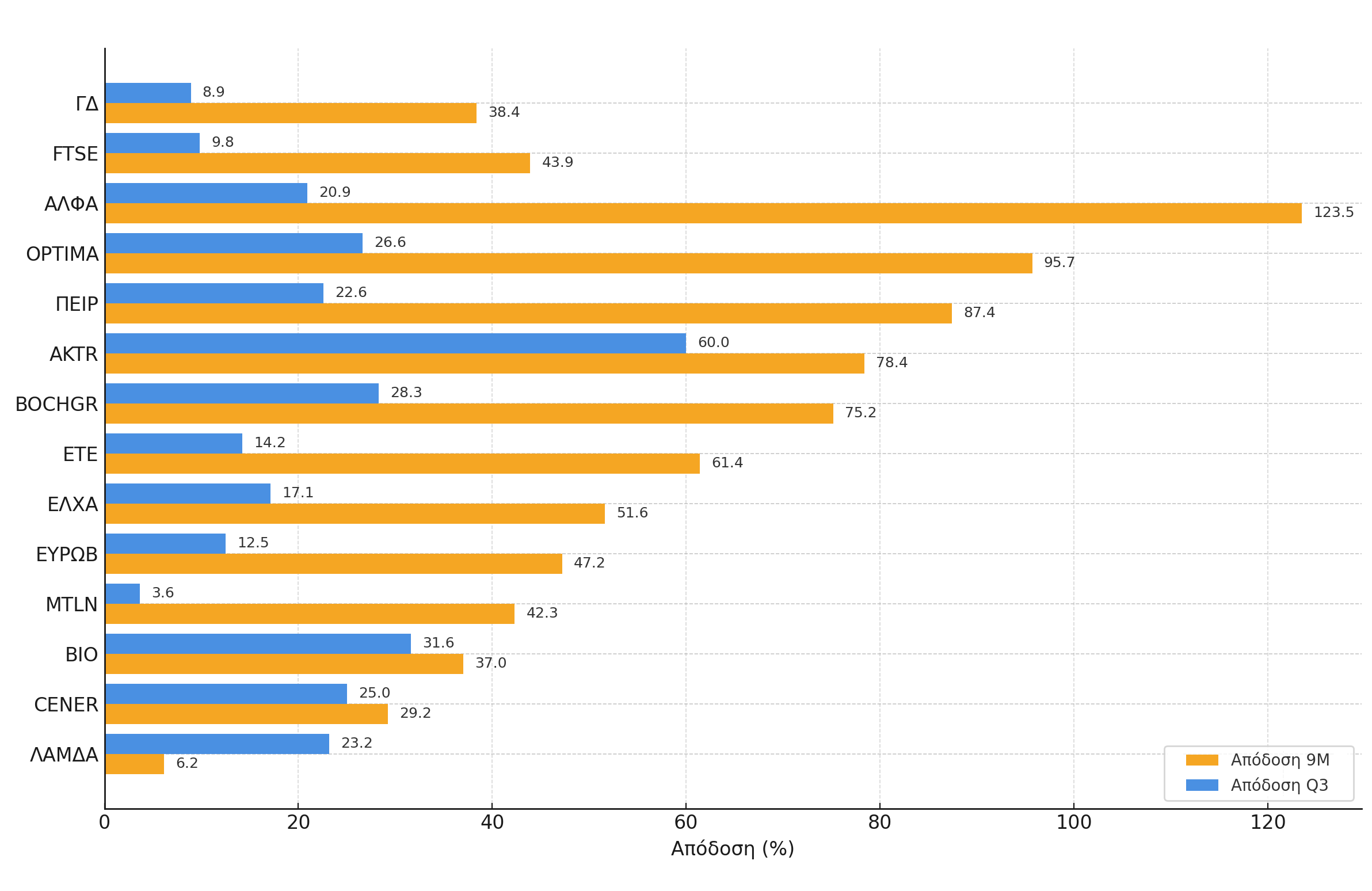 Το top-10 του γ’ τριμήνου συμπληρώνουν οι Lamda Development (+23,2%), Τρ. Πειραιώς (+22,6%), Alpha Bank (+20,9%), ElvalHalcor (+17,1%) και ΕΤΕ (+14,2%).