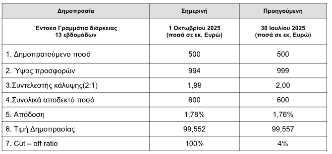 Η δημοπρασία πραγματοποιήθηκε μέσω των Βασικών Διαπραγματευτών Αγοράς (Primary Dealers), και η ημερομηνία διακανονισμού είναι η Παρασκευή 3 Οκτωβρίου 2025.