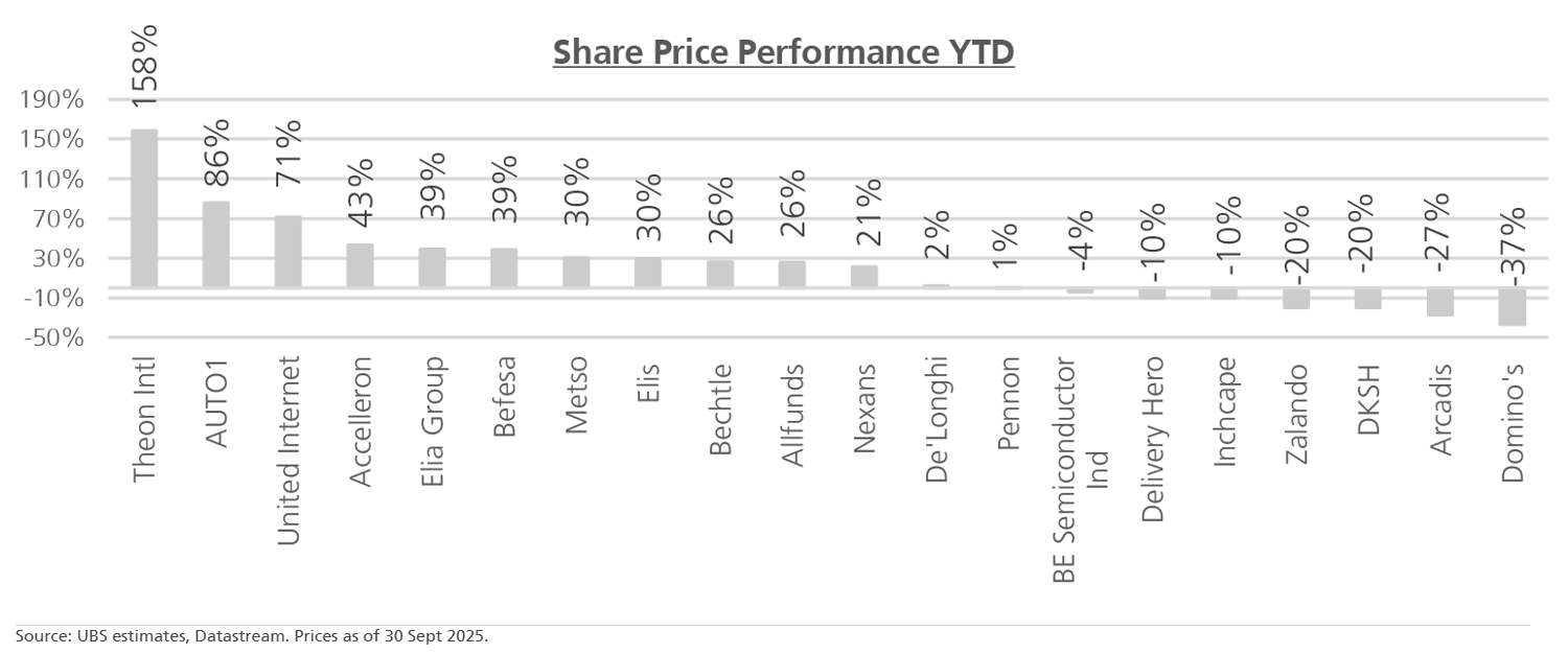 Φέτος, η κορυφαία σε απόδοση μετοχή αυτού του top-20 της UBS είναι, με διαφορά, η Theon με άνοδο 158%. Ακολουθεί η AUTO1 με κέρδη 86%, η UnitedInternet με άνοδο 71%, και οι Accelleron, Elia Group και Befesa με αποδόσεις 39%-43%.