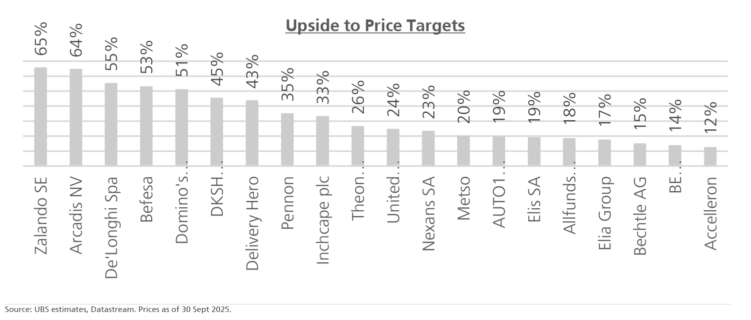 Με βάση τις τιμές-στόχους που έχουν δώσει μέχρι στιγμής οι αναλυτές της UBS, τα υψηλότερα περιθώρια ανόδου εμφανίζουν οι Zalando (+65%), Arcadis (64%), De'Longhi (55%), Befesa (53%) και Domino’s (51%).