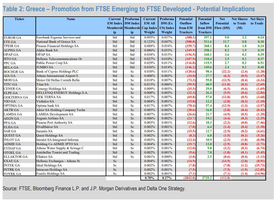 «Θυμόμαστε όταν η Ελλάδα αναβαθμίστηκε σε ανεπτυγμένη αγορά το 2001, το ενδιαφέρον για την αγορά κατέρρευσε ραγδαία. Υποθέτουμε ότι το ίδιο θα συμβεί ξανά» αναφέρει χαρακτηριστικά η JP Morgan.