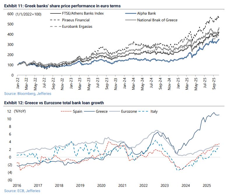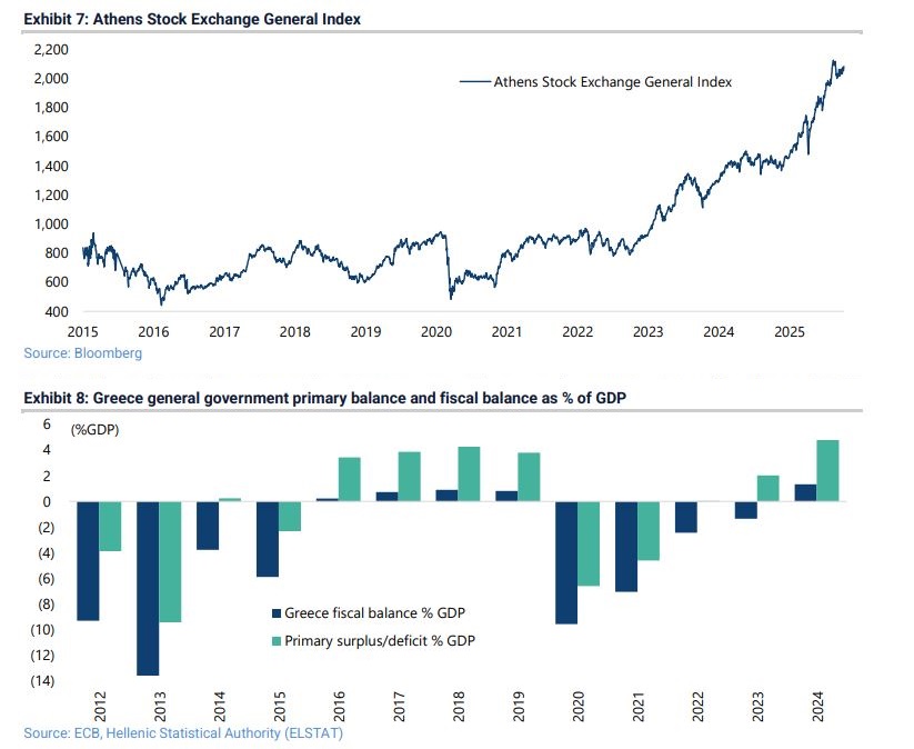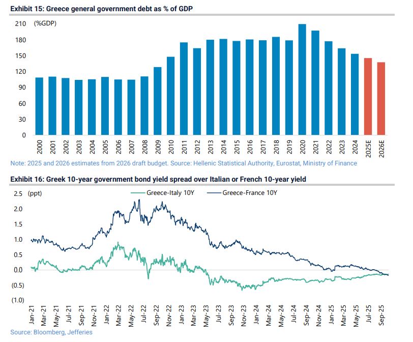 Τονίζει ότι το ποσοστό αυτό προβλέπεται να υποχωρήσει στο 137,6% του ΑΕΠ στο τέλος του 2026, από 145,4% φέτος, κάτι που αν επιβεβαιωθεί θα φέρει την Ελλάδα θα βρίσκεται κάτω από την Ιταλία ως προς τον δείκτη χρέους προς ΑΕΠ. «Για τους λόγους αυτούς, το δεκαετές ελληνικό κρατικό ομόλογο διαπραγματεύεται πλέον με χαμηλότερη απόδοση τόσο από το ιταλικό όσο και από το γαλλικό, κάτι απολύτως λογικό με βάση τη δημοσιονομική πρόοδο» αναφέρει χαρακτηριστικά.