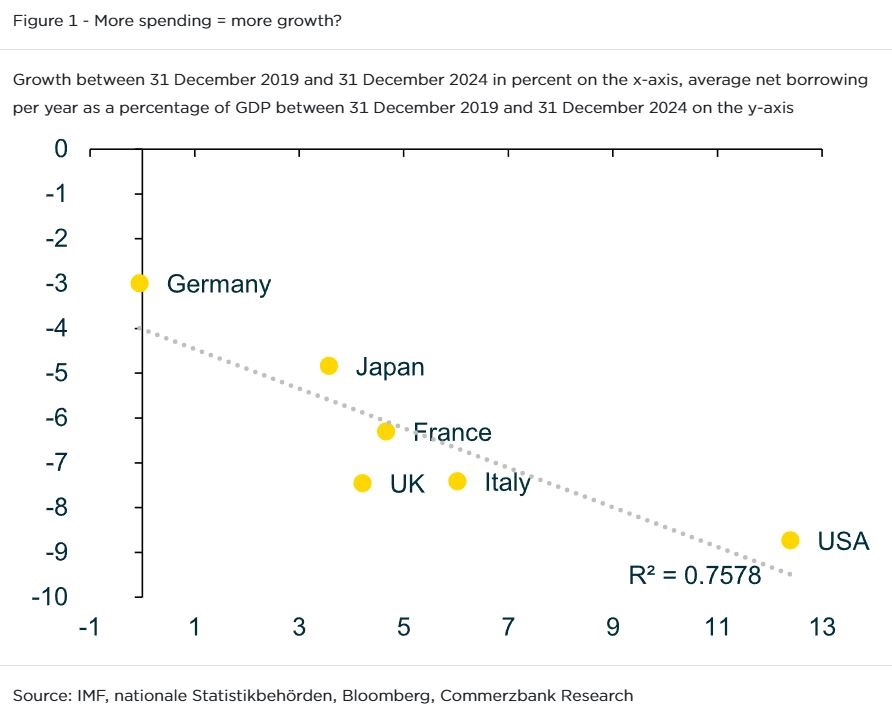 Επιπλέον, οι δαπάνες δεν οδηγούν πλέον κατ’ ανάγκη σε ανάπτυξη. Στις ΗΠΑ, για παράδειγμα, η οικονομία αποδυναμώνεται παρά τα ελλείμματα-ρεκόρ (αν και για διαφορετικούς λόγους), γεγονός που σημαίνει ότι η Fed δε μπορεί να το αγνοήσει και πρέπει να εφαρμόσει μια νομισματική πολιτική λιγότερο συσταλτική (π.χ. να μειώσει τα επιτόκια).