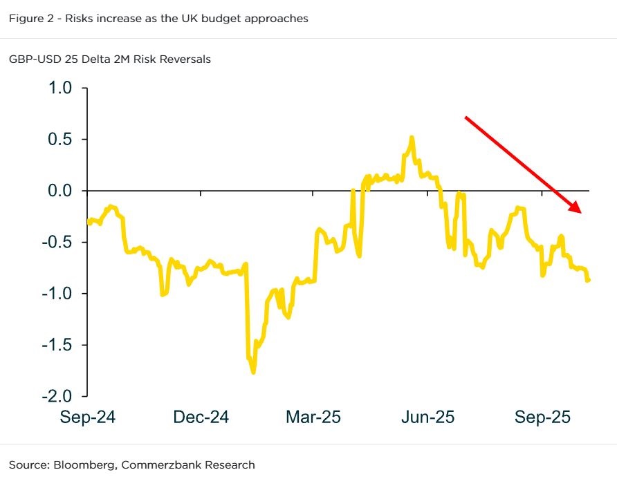 Το γράφημα της Commerzbank δείχνει ότι οι επενδυτές πληρώνουν πλέον περισσότερο για να προστατευθούν από μια πιθανή πτώση της στερλίνας, κάτι που σημαίνει ότι προεξοφλούν αυξημένο ρίσκο ενόψει του νέου βρετανικού προϋπολογισμού. Με απλά λόγια, η αγορά προετοιμάζεται για το ενδεχόμενο οι δημοσιονομικές αποφάσεις του Λονδίνου να κλονίσουν την εμπιστοσύνη στη σταθερότητα της οικονομίας και του νομίσματος.