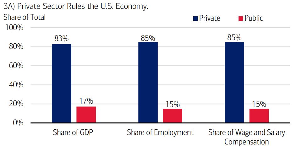 Οι Joseph Quinlan και Ariana Chiu της Bank of America-Merrill Lynch στέκονται αρχικά στις επιπτώσεις του shutdown, υπενθυμίζοντας ότι, παρόλο που ο δημόσιος τομέας των ΗΠΑ είναι κρίσιμος κρίκος της οικονομίας, η κινητήρια δύναμη της ανάπτυξης στηρίζεται στους ώμους του ιδιωτικού τομέα. Ο τελευταίος αντιπροσωπεύει περίπου το 83% του ΑΕΠ των ΗΠΑ, γύρω στο 85% της συνολικής απασχόλησης και παρόμοιο ποσοστό (85%) των συνολικών μισθών και απολαβών των Αμερικανών εργαζομένων.