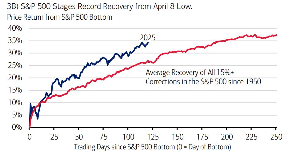 Οι αναλυτές της BofA-ML επισημαίνουν ότι η ανάκαμψη 34% του S&P 500 από το χαμηλό της 8ης Απριλίου υπήρξε εντυπωσιακή σε σχέση με τα ιστορικά δεδομένα. Η τρέχουσα άνοδος είναι η τέταρτη ισχυρότερη στην ιστορία, ενώ η άνοδος στο γ’ τρίμηνο (+7,8%) συγκαταλέγεται στις ισχυρότερες των τελευταίων 50 ετών.
