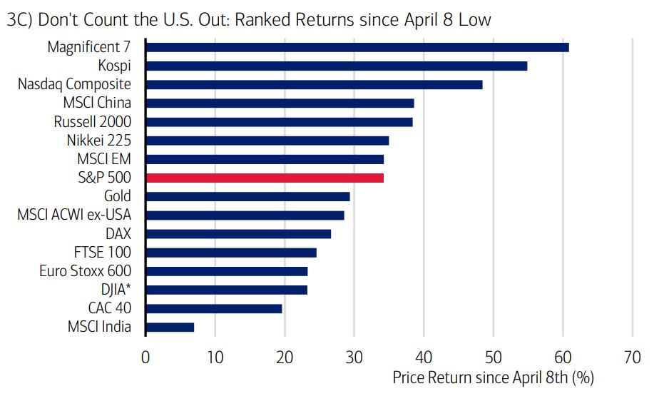 Εστιάζοντας στο διάστημα από τον Απρίλιο και μετά, οι αναλυτές της Bank of America-Merrill Lynch αναγνωρίζουν ότι η θεαματική άνοδος των «Magnificent 7» έδωσε ισχυρή ώθηση στον S&P 500, αλλά σχολιάζουν ότι ακόμη και οι μετοχές μικρής κεφαλαιοποίησης (Russell 2000) ξεπέρασαν την απόδοση του ιαπωνικού Nikkei, του δείκτη MSCI Emerging Markets ή ακόμη και του χρυσού τους τελευταίους έξι μήνες. Το ίδιο ισχύει και για τον S&P 500, που ξεπέρασε τον γερμανικό DAX, τον γαλλικό CAC, τον FTSE 100 και τον MSCI India.