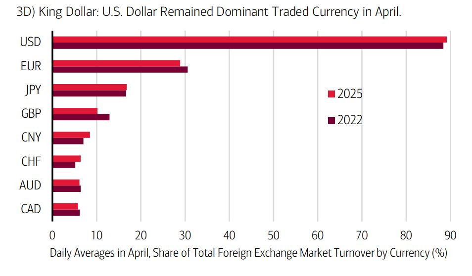 Επικαλούνται ως προς αυτό τα τελευταία στοιχεία της Τράπεζας Διεθνών Διακανονισμών, σύμφωνα με τα οποία ο ημερήσιος όγκος συναλλαγών στην αγορά συναλλάγματος έφθασε τα 9,6 τρισ. δολάρια τον Απρίλιο του 2025, λόγω της αυξημένης μεταβλητότητας και της έντονης δραστηριότητας που ακολούθησε την επιβολή των αμερικανικών δασμών. Το δολάριο συμμετείχε στο 89,2% όλων των συναλλαγών, από 88,4% το 2022, ενώ το «μερίδιο αγοράς» του ευρώ και της στερλίνας μειώθηκε.