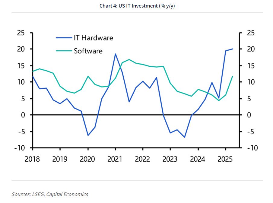 Στην ίδια κατεύθυνση κινείται και η ανάλυση του επικεφαλής οικονομολόγου της Capital Economics, Neil Shearing. Επισημαίνει ότι οι εκτιμήσεις για την πορεία της αμερικανικής οικονομίας έχουν διαψευστεί μέχρι στιγμής, ιδίως σε ό,τι αφορά τον ρυθμό ανάπτυξης, κι αυτό παρά την αβεβαιότητα λόγω των δασμών, τα εμπόδια στην αγορά εργασίας από τη μεταναστευτική πολιτική της κυβέρνησης και του shutdown.