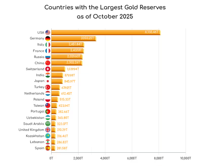 Από τον Οκτώβριο, οι ΗΠΑ είναι η χώρα με τα μεγαλύτερα αποθέματα χρυσού, σύμφωνα με την BestBrokers, μια πλατφόρμα επενδυτικής έρευνας, η οποία επικαλείται στοιχεία από το WGC και το Διεθνές Νομισματικό Ταμείο.