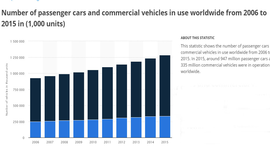 Ο ρυθμός αύξησης του παγκόσμιου αριθμού οχημάτων δεν φαίνεται ωστόσο να ανακόπτεται. Όπως φαίνεται στο διάγραμμα που ακολουθεί, το 2006 στον πλανήτη κινούνταν κάτι λιγότερο από 1.000.000.000 τετράτροχα οχήματα, ενώ το 2017 ξεπερνούν το 1.300.000 –τα τελευταία διαθέσιμα στοιχεία αφορούν το 2015, όπου κυκλοφορούσαν 1.272.000.000 οχήματα.