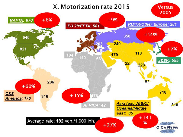 Χαρακτηριστικά είναι τα στοιχεία που δίνει ο Διεθνής Σύνδεσμος Κατασκευαστών Aυτοκινήτων (www.oica.net). Στον παγκόσμιο χάρτη, μπορούμε να δούμε αγορές οι οποίες παρουσίασαν αύξηση των οχημάτων που αντιστοιχούν σε 1.000 κατοίκους την τελευταία δεκαετία, η οποία φτάνει το 141%, στην περίπτωση της Ασίας, ή το 60% στην περίπτωση της Λατινικής Αμερικής.