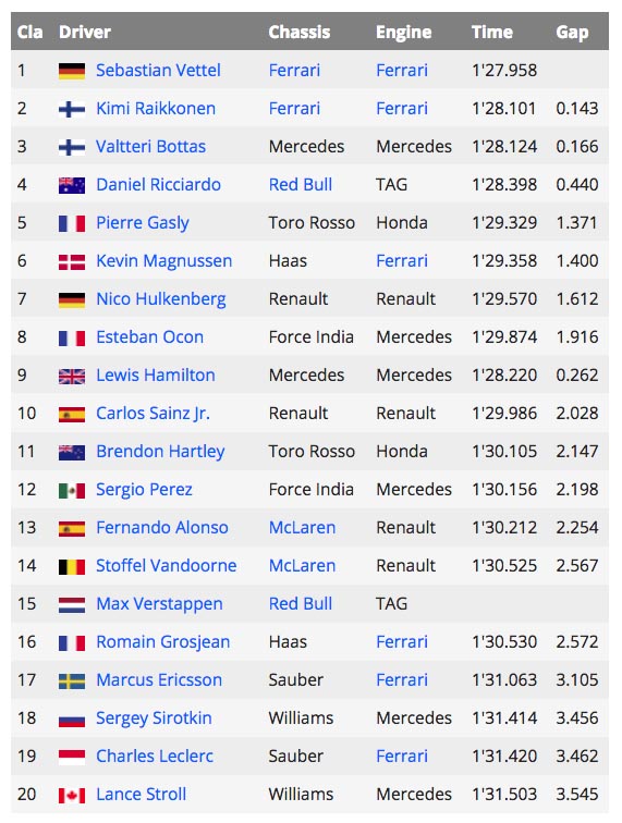 Στην πρώτη δεκάδα της εκκίνησης θα είναι επίσης μόνο μια Red Bull, αυτή του Ρικιάρντο στην 4η θέση, καθώς ο Φερστάπεν στην πρώτη περίοδο των κατατακτήριων πάτησε άτσαλα πάνω σε ένα κερμπ, έχασε τον έλεγχο του μονοθέσιου με κατέληξε στον τοίχο. Απογοήτευση οι Williams με τους Σιρότκιν και Σκρολ, που φέτος δεν τα πάνε καθόλου καλά, αλλά και οι Alfa Romeo/Sauber που με τους Λεκλέρκ και Έρικσον δεν δείχνουν ικανές να ξεφύγουν από τις τελευταίες θέσεις. Ιδιαίτερη ήταν η έκπληξη του Γκασλί, ο οποίος με την Toro Rosso/Honda θα εκκινήσει από την 5η θέση.