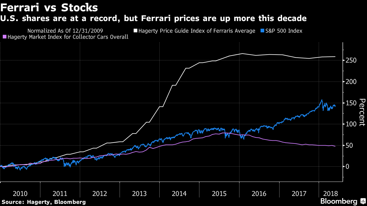Και ενώ το ρεκόρ του S&P 500 την Παρασκευή κέρδισε πολλούς τίτλους στα μέσα ενημέρωσης, φαίνεται πως το ιταλικό σπορ αυτοκίνητο ήταν η πιο κερδοφόρα επένδυση. Ο δείκτης Hagerty των τιμών Ferrari έχει τριπλασιαστεί αυτή τη δεκαετία, ξεπερνώντας το άλμα 158% της καλπάζουσας αγοράς μετοχών των ΗΠΑ.