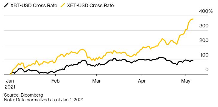 Στην αγορά των futures, ο όγκος του Ether πλησιάζει αυτόν των συμβολαίων Bitcoin, παρότι η αμερικανική εταιρεία παγκόσμιων αγορών CME Group Inc. ξεκίνησε συναλλαγές τον Φεβρουάριο του 2020.