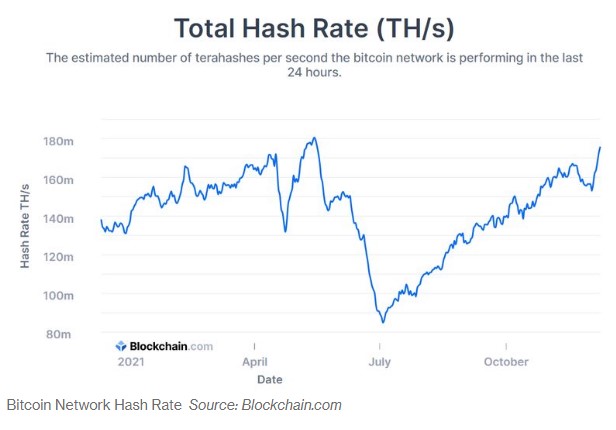 Το hash rate, το οποίο μετρά την υπολογιστική ισχύ που απαιτείται για την εξόρυξη και την επεξεργασία των συναλλαγών, κορυφώθηκε σε περίπου 180 εκατομμύρια terahashes ανά δευτερόλεπτο στις 14 Μαΐου, σύμφωνα με στοιχεία του Blockchain.com. Eίχε πέσει στα 86 εκατομμύρια στις 4 Ιουλίου, καθώς η Κίνα -η οποία στο παρελθόν ήταν μακράν η μεγαλύτερη βάση για τους miners- απαγόρευσε την πρακτική αυτή αναγκάζοντας τους να εγκαταλείψουν τις επιχειρήσεις τους στην χώρα. Από την Τετάρτη, ανήλθε και πάλι στα 176 εκατομμύρια.