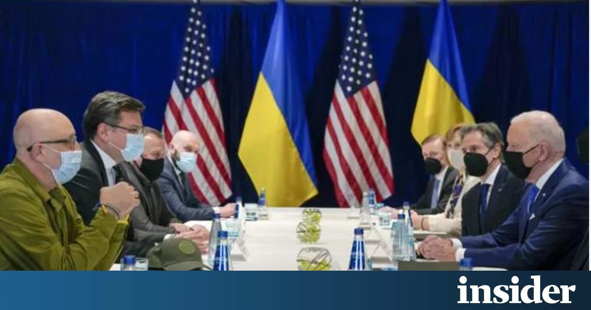 Ο Μπάιντεν, ο οποίος συναντήθηκε για πρώτη φορά από την έναρξη του πολέμου με υψηλά ιστάμενους Ουκρανούς αξιωματούχους, είχε ανεπίσημη συνομιλία με τον επικεφαλής της ουκρανικής διπλωματίας Ντμίτρο Κουλέμπα δίπλα στον οποίο κάθισε σε ένα μακρύ τραπέζι όπου κάθονταν επίσης ο Ουκρανός υπουργός Άμυνας Ολέξι Ρεσνίκοφ, ο Αμερικανός υπουργός Εξωτερικών Αντονι Μπλίνκεν και ο Αμερικανός υπουργός Άμυνας Λόιντ Όστιν.