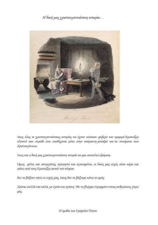 «Οι δικές μας ευχές είναι πέρα και πάνω από τους Εμπενίζερ (Σκρουτζ) αυτού του κόσμου. Δεν το βάζουν κάτω οι ευχές μας, όπως δεν το βάζουμε κάτω κι εμείς», αναφέρεται μεταξύ άλλων στην ιδιότυπη ευχετήρια κάρτα του υπουργείου που... βρίθει υπονοούμενων.