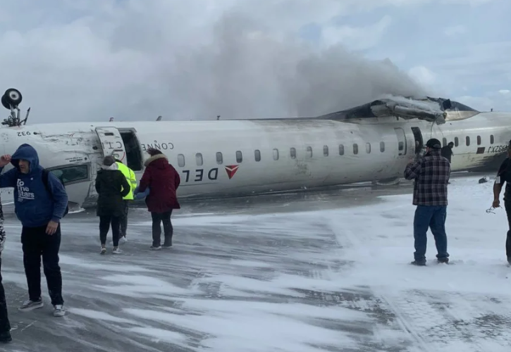 Η καναδική τηλεόραση μεταδίδει βίντεο στο οποίο διακρίνεται το αεροσκάφος της Delta αναποδογυρισμένο στη χιονισμένη πίστα του διεθνούς αεροδρομίου Πίρσον. Τα αίτια της συντριβής παραμένουν αδιευκρίνιστα.