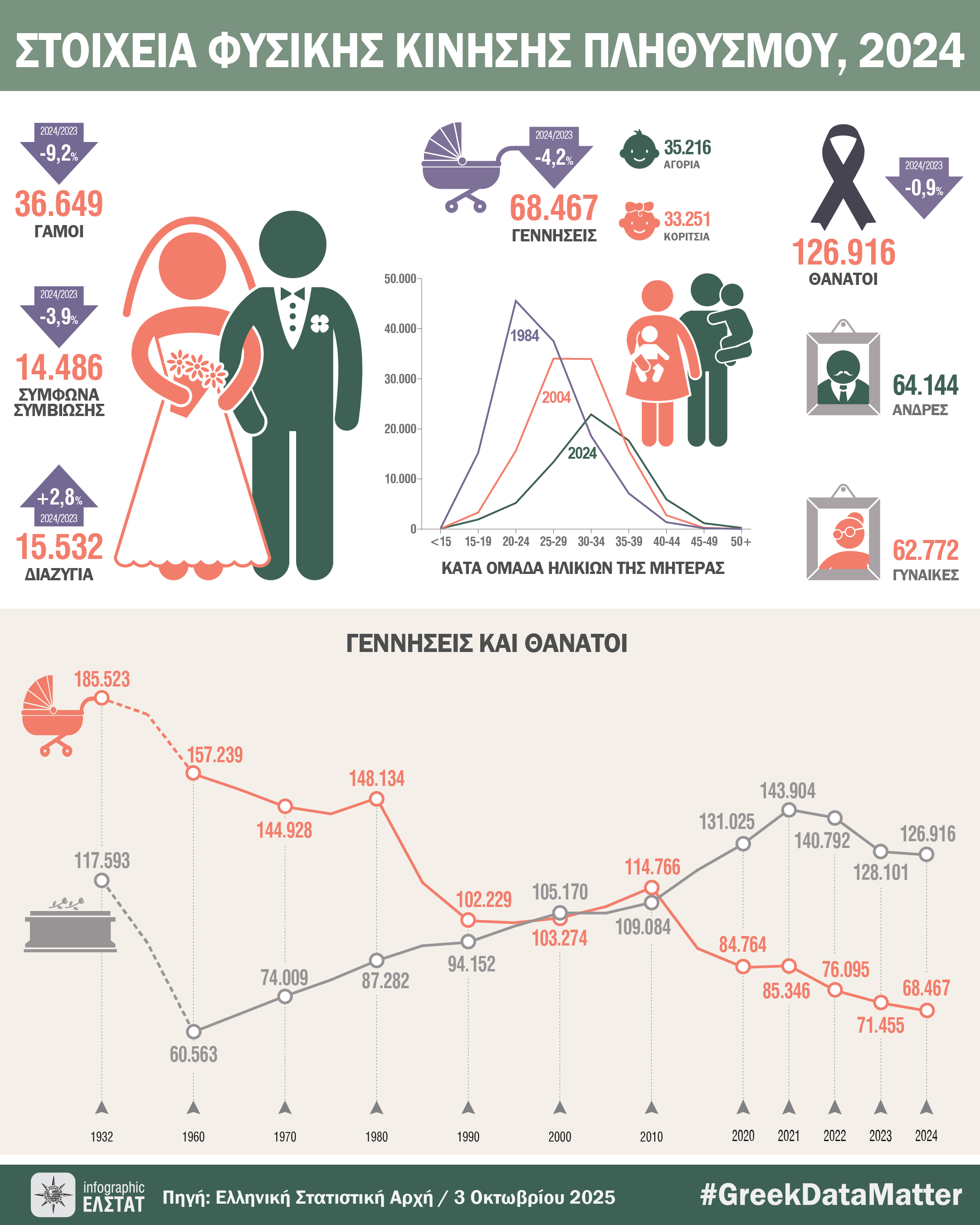 Ειδικότερα, σύμφωνα με την έρευνα της ΕΛΣΤΑΤ για τη φυσική κίνηση πληθυσμού, οι γεννήσεις στην Ελλάδα το 2024 ανήλθαν σε 68.467 γεννήσεις (35.216 αγόρια και 33.251 κορίτσια) καταγράφοντας μείωση 4,2% σε σχέση με το 2023 που ήταν 71.455 γεννήσεις (36.622 αγόρια και 34.833 κορίτσια). Στις γεννήσεις δεν συμπεριλαμβάνονται οι γεννήσεις νεκρών, οι οποίες το 2024 ανήλθαν σε 454, αυξημένες κατά 5,1% σε σχέση με το 2023 που ήταν 432.