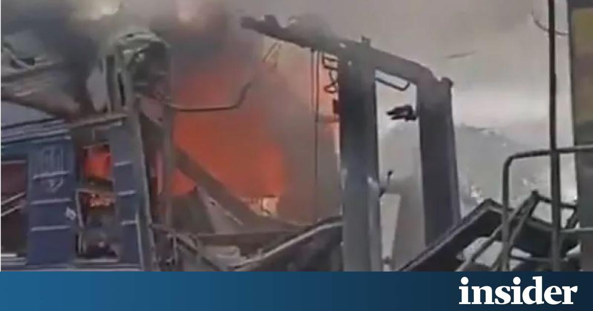Ο Ζελένσκι ανάρτησε επίσης ένα βίντεο που δείχνει ένα κατεστραμμένο βαγόνι τρένου να έχει τυλιχτεί στις φλόγες.