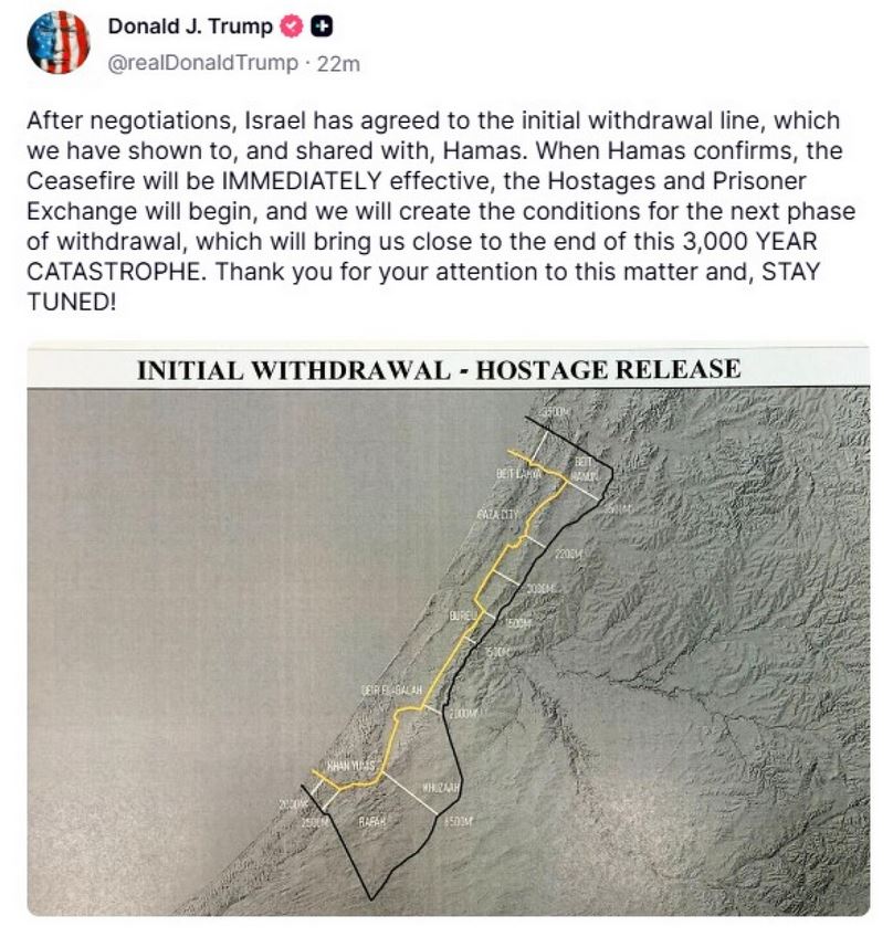 Με νέα ανάρτησή του στο μέσο κοινωνικής δικτύωσης Truth, ο πρόεδρος Τραμπ έκανε γνωστό ότι ύστερα από διαπραγματεύσεις, το Ισραήλ αποδέχθηκε την αρχική πρόταση αποχώρησης, την οποία οι Ηνωμένες Πολιτείες έχουν ήδη παρουσιάσει και στη Χαμάς. Μάλιστα ο πρόεδρος των ΗΠΑ δημοσίευσε και σχετικό χάρτη.