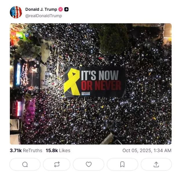 Με ανάρτησή του στο μέσο κοινωνικής δικτύωσης Truth, ο Αμερικανός πρόεδρος Ντόναλντ Τραμπ παρουσίασε φωτογραφία από τη μεγάλη συγκέντρωση που πραγματοποιήθηκε το βράδυ του Σαββάτου στην Πλατεία Ομήρων στο Τελ Αβίβ. Παράλληλα έκανε έκανε νέα έκκληση στην κυβέρνηση του Μπενιαμίν Νετανιάχου να δεχθεί το σχέδιο του για κατάπαυση του πυρός στη Γάζα.