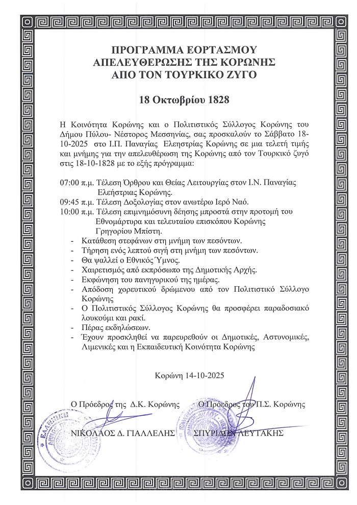 Η Κοινότητα και ο Πολιτιστικός Σύλλογος Κορώνης του Δήμου Πύλου – Νέστορος Μεσσηνίας προσκαλούν όλους τους δημότες και φίλους της περιοχής στην τελετή τιμής και μνήμης για την Απελευθέρωση της Κορώνης από τον Τουρκικό ζυγό, που θα πραγματοποιηθεί την Σάββατο18 Οκτωβρίου 2025, στην Παναγία Ελεήστρια.