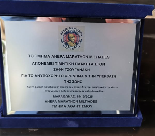 Με ιδιαίτερη συγκίνηση και υπερηφάνεια, το Τμήμα AHEPA MARATHON MILTIADES τίμησε σήμερα τον αθλητή μαραθωνίου και στίβου, Σήφη Τζουγανάκη, έναν άνθρωπο-σύμβολο δύναμης, πίστης και ψυχικού σθένους.