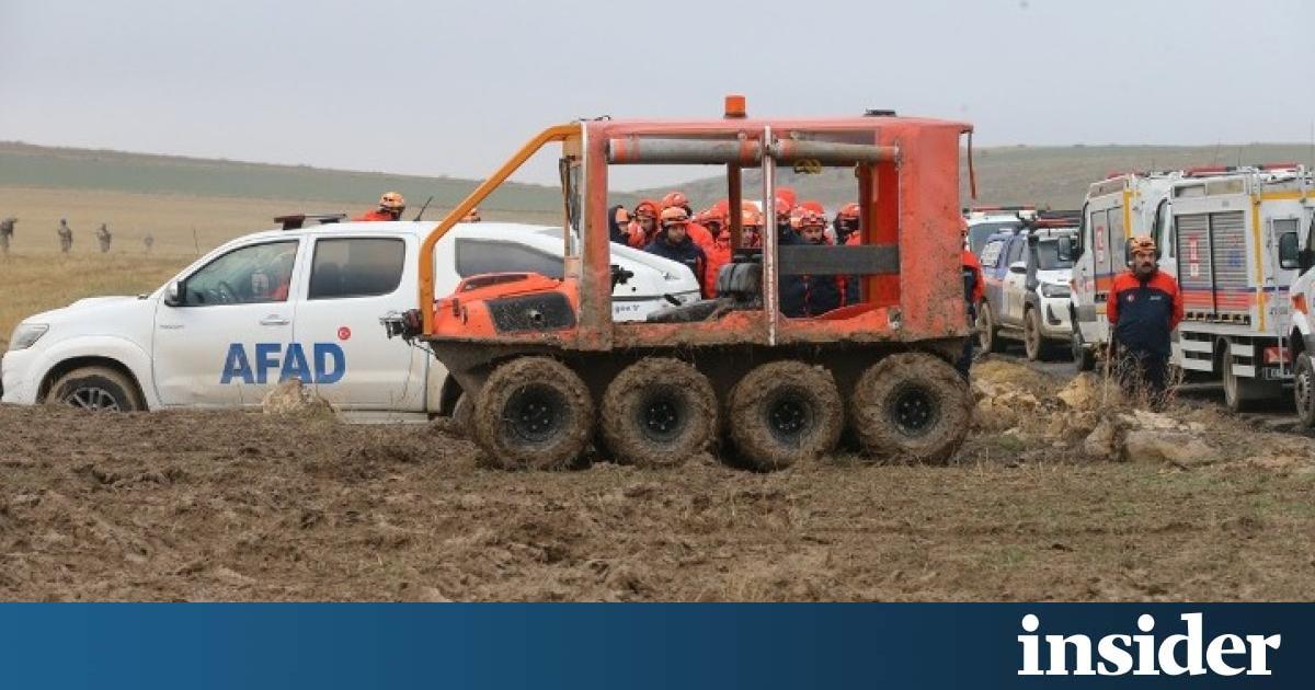 Τουρκικές δυνάμεις ασφαλείας, ιατρικό προσωπικό και ομάδες έρευνας και διάσωσης σαρώνουν την περιοχή στο σημείο της συντριβής.