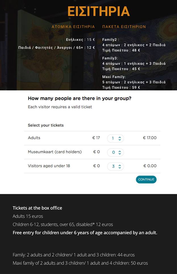 Στην εικόνα παρουσιάζονται οι τιμές των οικογενειακών εισιτηρίων της έκθεσης στην Ελλάδα, κατόπιν τα εισιτήρια του Μουσείου Βαν Γκογκ που φιλοξενεί τα πρωτότυπα έργα και, στο τέλος, τα εισιτήρια της αντίστοιχης έκθεσης στην Ιταλία: