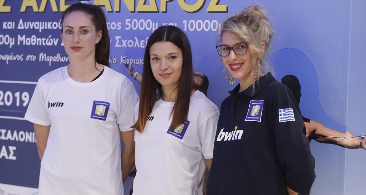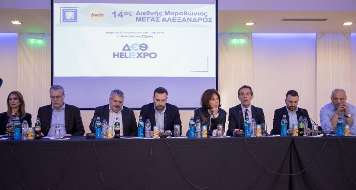 Παράλληλα, παρουσίασαν τους Χορηγούς του 14ου Διεθνούς Μαραθωνίου ΜΕΓΑΣ ΑΛΕΞΑΝΔΡΟΣ - bwin: τον Ονομαστικό Χορηγό της διοργάνωσης bwin, τον Μέγα Χορηγό και Ονομαστικό Χορηγό του Δρόμου 1.000μ. Μαθητών Δημοτικών Σχολείων DOLE Hellas, τον Μέγα Χορηγό Kosmocar Α.Ε. - Volkswagen, τον Κύριο Χορηγό Coca-Cola Tρία Έψιλον με το Φυσικό Μεταλλικό Νερό ΑΥΡΑ, τον Κύριο Χορηγό και Αποκλειστικό Χορηγό Ενέργειας ZeniΘ, τον Αποκλειστικό Τηλεοπτικό Φορέα της διοργάνωσης ΕΡΤ3, η οποία έχει αναλάβει τη ζωντανή μετάδοσή της, τη NOVA που αποτελεί Media Partner της διοργάνωσης, τους Χορηγούς ΔΕΘ-HELEXPO, ΙΚΕΑ, DHL, Arla Protein, ΙΕΚ ΑΚΜΗ, Euromedica Γενική Κλινική, Amstel Free, Παπαδοπούλου Α.Ε., τους Υποστηρικτές ORIS, Stihl, Saucony HIGH5, Run Hike, τους Προμηθευτές Maxim Catering, Plaisir, Village Cinemas, TaxiWay, BeSmart, Women Techmakers, House Of Sports, Μέγαρο Μουσικής Θεσσαλονίκης, Grand Hotel Palace, Μητροπολιτικό Κολλέγιο Θεσσαλονίκης, καθώς και τους Χορηγούς Επικοινωνίας της διοργάνωσης.