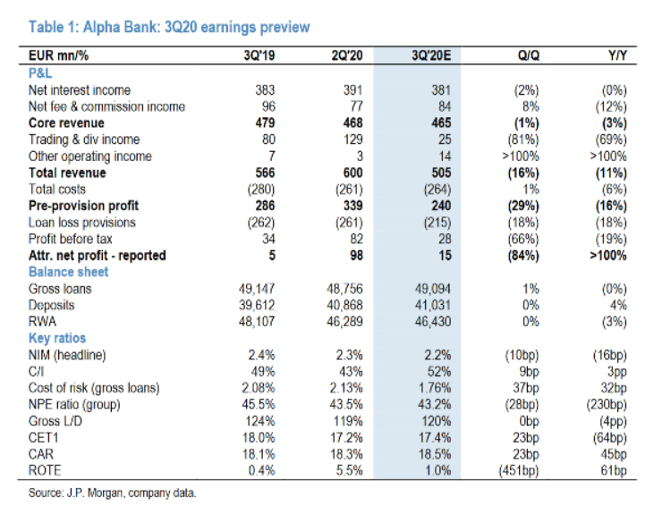 Όπως σημειώνει η JP Morgan, τα τριμηνιαία χρηματοοικονομικά θα είναι αναμφισβήτητα λιγότερο σημαντικά, εν μέσω του δεύτερου lockdown, καθώς στο επίκεντρο θα βρεθούν τα έσοδα και οι προοπτικές ποιότητας των assets για το δ' τρίμηνο και το 2021. Ο εποικοδομητικός τόνος που τέθηκε στο β' τρίμηνο θα πρέπει να συνεχιστεί, ειδικά σε ότι αφορά τις τιτλοποιήσεις, καθώς μπαίνουμε σε δύο πιο γεμάτα τρίμηνα από άποψη εξελίξεων και γεγονότων, όπως σημειώνει η αμερικανική τράπεζα.