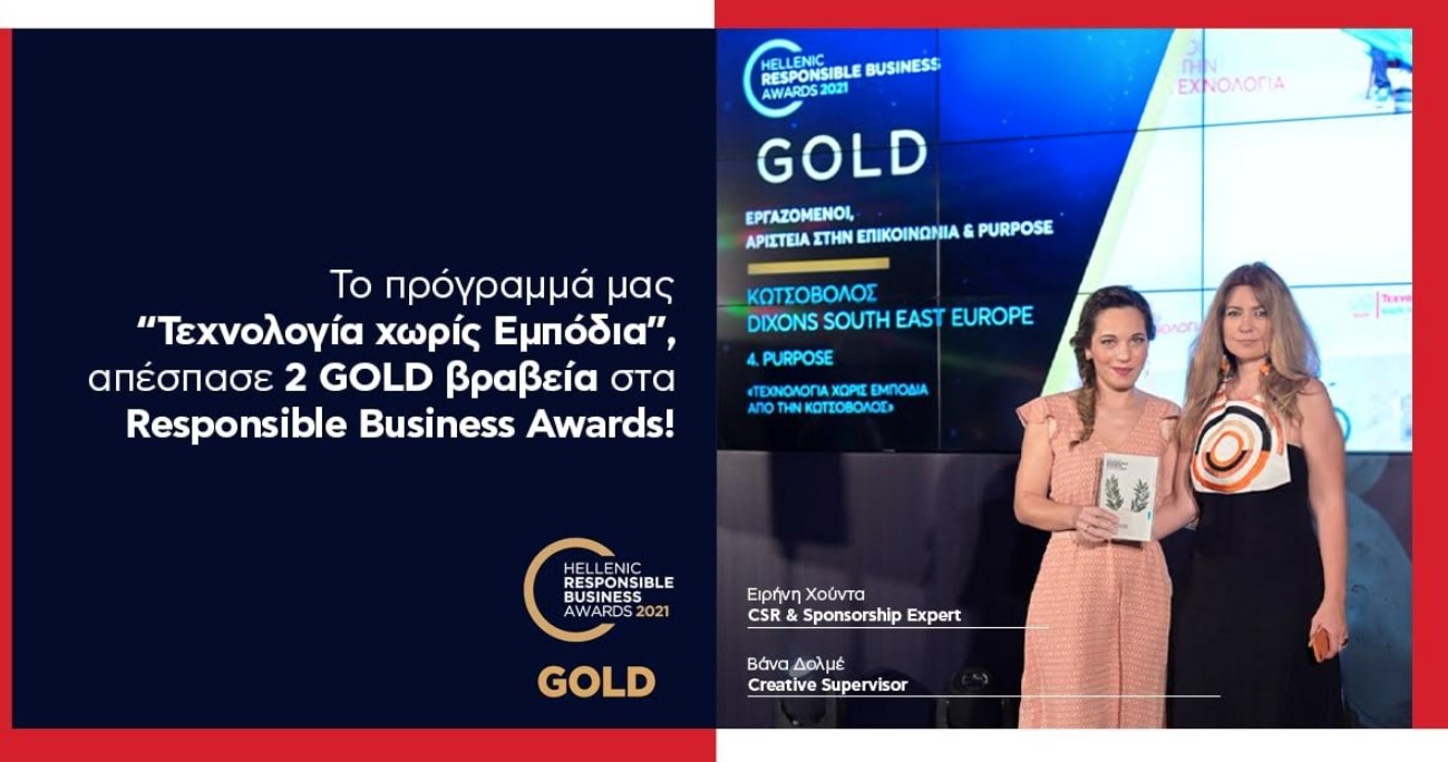 Στο πλαίσιο του 6ου Hellenic Responsible Business Awards, την Πέμπτη 1η Ιουλίου 2021 στο Κέντρο Πολιτισμού «Ελληνικός Κόσμος», πραγματοποιήθηκε η τελετή απονομής των βραβείων σε επιχειρήσεις που προωθούν τις αξίες της Υπεύθυνης Επιχειρηματικότητας και επενδύουν στη Βιώσιμη Ανάπτυξη. Η Κωτσόβολος διακρίθηκε, ανάμεσα σε άλλες μεγάλες εταιρείες της αγοράς, με δύο χρυσά βραβεία για το πρόγραμμα «Τεχνολογία Χωρίς Εμπόδια» στις κατηγορίες Purpose και Προσβασιμότητα.