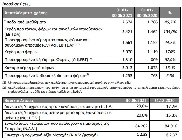 Η αύξηση αυτή επιτεύχθηκε παρά τη μείωση των εσόδων κατά 951.000 ευρώ στο α΄ εξάμηνο του 2021 εξαιτίας των μέτρων που επιβλήθηκαν λόγω COVID-19 για μείωση των μισθωμάτων, ενώ η αντίστοιχη μείωση του α’ εξαμήνου του 2020 ήταν σημαντικά χαμηλότερη (€ 374 χιλ.). H αύξηση των εσόδων κατά 46% οφείλεται κυρίως στην ενσωμάτωση των εσόδων από τις νέες επενδύσεις του Ομίλου σε logistics την προηγούμενη δωδεκάμηνη περίοδο.