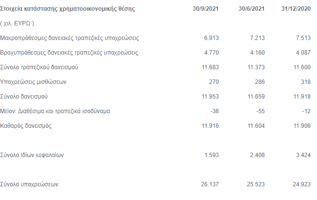Τα παραπάνω, καθώς και οι μεταβολές στην δανειακή θέση, την κεφαλαιακή διάρθρωση και τα λοιπά μεγέθη της κατάστασης χρηματοοικονομικής θέσης που έλαβαν χώρα κατά το τρίτο' τρίμηνο της χρήσης 2021 απεικονίζονται στους ακόλουθους πίνακες :