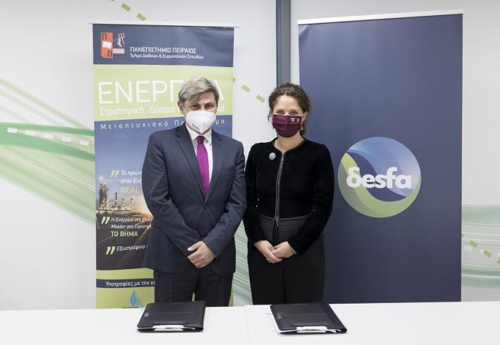 Μνημόνιο Συνεργασίας υπέγραψαν την Πέμπτη, 3 Φεβρουαρίου 2022, ο Διαχειριστής Εθνικού Συστήματος Φυσικού Αερίου (ΔΕΣΦΑ) και το αγγλόφωνο Μεταπτυχιακό Πρόγραμμα Σπουδών (ΠΜΣ) στην Ενέργεια: Στρατηγική, Δίκαιο και Οικονομία (MSc in Energy Strategy, Law & Economics) του Τμήματος Διεθνών και Ευρωπαϊκών Σπουδών του Πανεπιστημίου Πειραιώς.