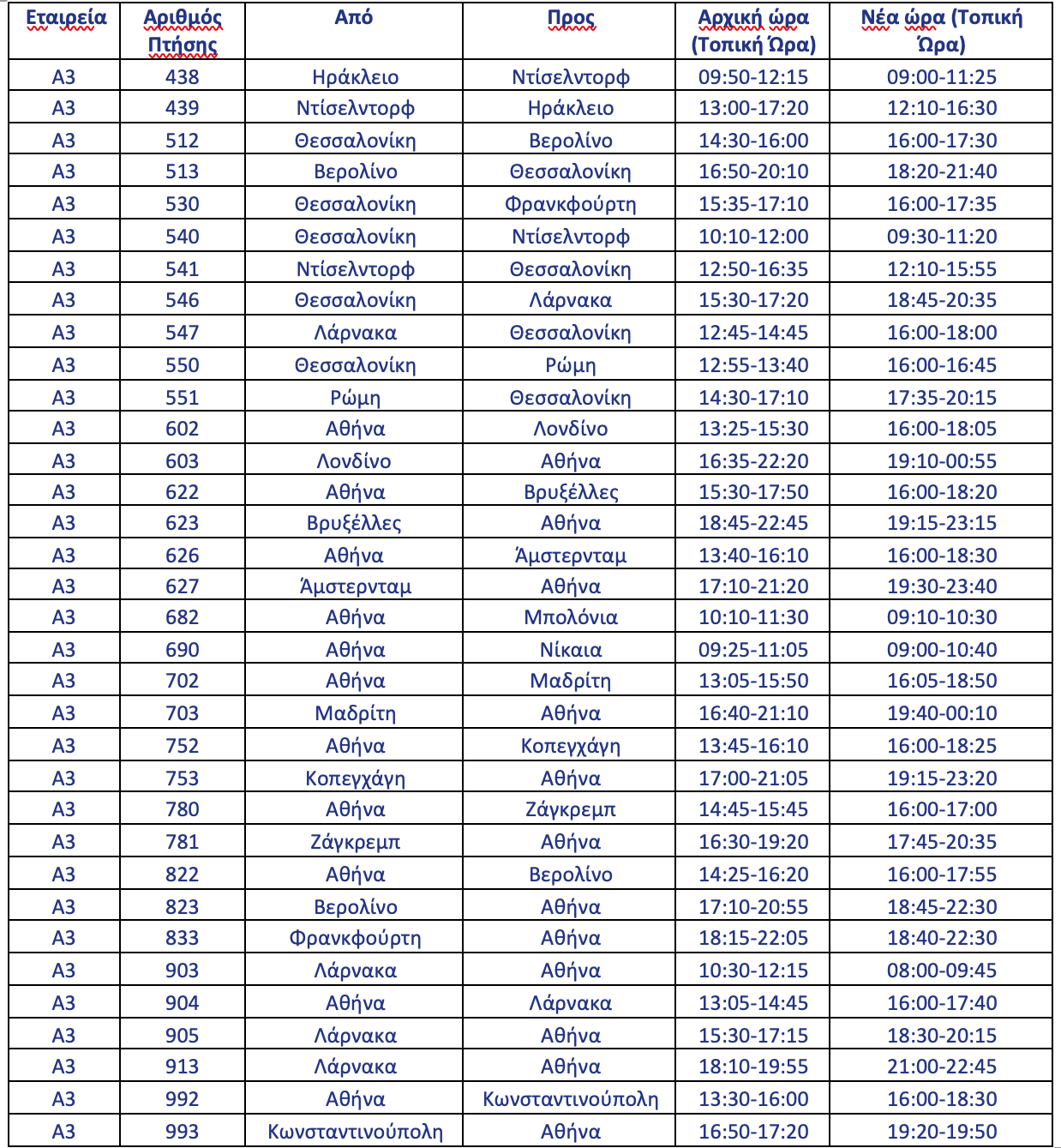 Τέλος θα τροποποιηθούν οι ακόλουθες πτήσεις εσωτερικού της Aegean: