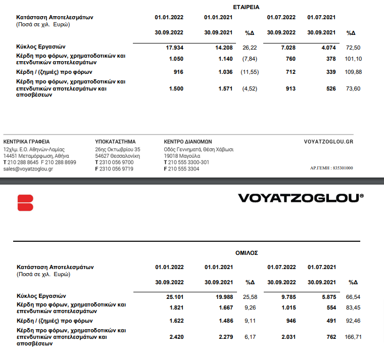 Αύξηση 9,11% εμφάνισαν τα προ φόρων κέρδη της Βογιατζόγλου ΑΕ για το 9μηνο του 2022 σε ετήσια βάση και σε επίπεδο ομίλου.