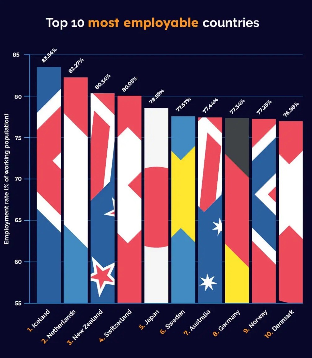 Αναφορικά με την απασχόληση, η Ισλανδία βρίσκεται στην πρώτη θέση με ποσοστό 83,54%. Η Ολλανδία καταλαμβάνει ένα 82,27% και η Νέα Ζηλανδία ένα 80,34%.