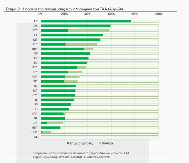 Επιπλέον, μπορεί να υποβόσκουν καθυστερήσεις, εμπόδια, αστοχίες ή άλλα προβλήματα τα οποία δεν έχουν αποτυπωθεί ακόμα στους προαναφερθέντες «σκληρούς δείκτες». Ενδεικτικά, σύμφωνα με πρόσφατη ανάλυση της Τραπέζης της Ελλάδος, λιγότερο από το ¼ των πόρων που είχε λάβει η Ελλάδα ως δάνεια από το ΤΑΑ μέχρι τον Απρ-24 είχαν φτάσει στους τελικούς αποδέκτες τους (ιδιωτικές επιχειρήσεις), μεταξύ άλλων, λόγω γραφειοκρατίας. Για τις επιχορηγήσεις το ποσοστό αυτό ήταν σημαντικά μεγαλύτερο, στο 45% του ποσού που έχει ληφθεί από το ΤΑΑ. Ένα επιπλέον 31% είχε μεταφερθεί στις περιφέρειες, τους δήμους και άλλες αρχές και οργανισμούς υλοποίησης, χωρίς όμως να υπάρχουν δημόσια διαθέσιμα στοιχεία για την πορεία των επιμέρους χρηματοδοτούμενων έργων.