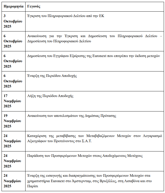 Εκτιμάται ότι τα αποτελέσματα της Δημόσιας Πρότασης θα ανακοινωθούν στις 19 Νοεμβρίου 2025 και η παράδοση των Προσφερόμενων Μετοχών προς τους Αποδεχόμενους Μετόχους θα ολοκληρωθεί κατά ή περίπου στις 24 Νοεμβρίου 2025, υπό την προϋπόθεση ότι έχουν πληρωθεί οι όροι που αναφέρονται στην παράγραφο 7 κατωτέρω.