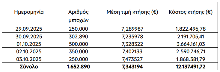 Κατόπιν των ανωτέρω αγορών, η Εταιρεία κατέχει συνολικά 2.772.752 ίδιες μετοχές, οι οποίες αντιστοιχούν σε ποσοστό 0,22% του καταβεβλημένου – κατά την ημερομηνία λήψης της απόφασης της τακτικής Γ.Σ. που ενέκρινε το πρόγραμμα – μετοχικού κεφαλαίου.