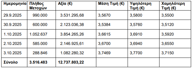 Ειδικότερα, κατά το διάστημα 17/09/2025 – 19/09/2025, απέκτησε συνολικά 3.516.483 ίδιες μετοχές, με μέση τιμή κτήσης 3,6227 ευρώ ανά μετοχή και συνολικό κόστος 12.737.803,22 ευρώ.
