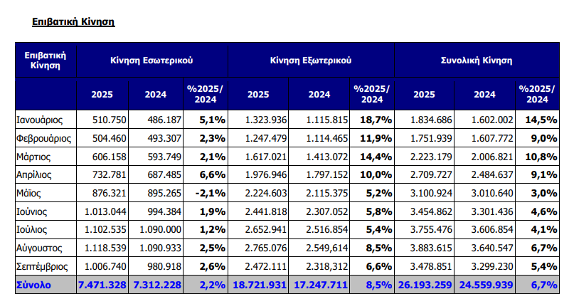 Τον Σεπτέμβριο, η επιβατική κίνηση πραγματοποίησε ετήσιο άλμα 5,4% σε 3,48 εκατ. ταξιδιώτες ενώ τόσο η εγχώρια, όσο και η διεθνής επιβατική κίνηση παρουσίασαν άνοδο, υπερβαίνοντας τα επίπεδα του 2024 κατά 2,6% και 6,6% αντίστοιχα.
